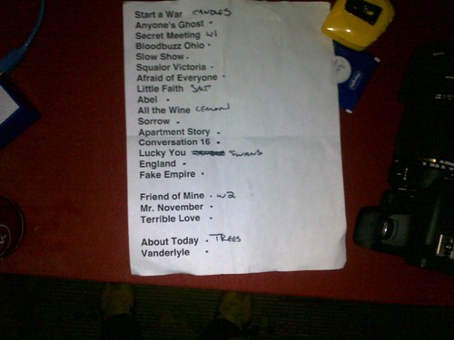 A esgotada plateia lisboeta viveu com emoção, suor (um calor infernal mais próprio de uma noite de verão do que de primavera) e dedicação cada uma das mais de duas dezenas de canções apresentadas. Quando é que se sabe que a noite foi mesmo especial? Quando temos no alinhamento o tema «Friend of Mine» (do álbum «Alligator») que a banda não tocou o vivo mais de duas vezes nos últimos largos anos. Hoje tocaram-no pela promessa feita a um grupo de fãs lusos, que andam há mais de quatro anos a pedirem para o ouvir, que hoje lhes iam fazer uma surpresa! Foi desta maneira que começou o primeiro encore após a primeira despedida ao som da fantástica «Fake Empire», uma das canções de marca dos National.