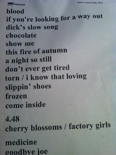 As três primeiras canções da noite evocaram discos antigos, «Blood» do registo de estreia em 1993, «If You're Looking For a Way Out» de 1999 e «Dick's Slow Song» de 1997. Também houve passagem por 1995 com »«Cherry Blossoms». Ou seja, os emblemáticos quatro primeiros discos que agarraram fãs para toda a vida não são esquecidos e continuam a soar muito bem no meio desta lufada de ar fresco que é o novo álbum.