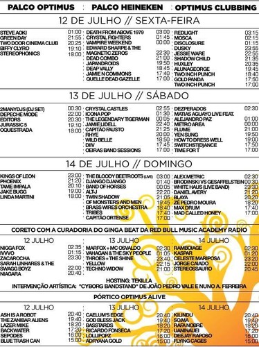 Voltemos ao palco Optimus para dizer que os franceses Phoenix surpreenderam positivamente com um espectáculo muito bem montado à volta do excelente «Bankrupt!», disco editado este ano, que alimenta bem um alinhamento que vai buscar «If I Ever Feel Better», «Everything is Everything» ou «Liztomania» a nos mais distantes e que facilmente convence o público que não nega um pé de dança. Antes disso, pelas 20h00, os australianos Tame Impala deram o seu último concerto desta digressão europeia e conseguiram romper aquela barreira sónica que se adivinhava complicada para os festivaleiros que não os conheciam. O rock sónico em viagem constante ao psicadelismo dos anos 60 sempre a prometer um formato de canção mais tradicional mas que nunca deixa de improvisar pelo menos óbvio, tudo guiado por Kevin Parker feliz com a recepção do público. Nota positiva.