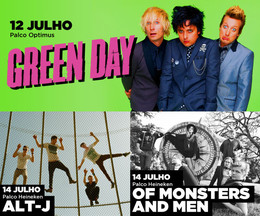 Green Day (12 de Julho), Alt-J (14 de Julho) e Of Monsters and Men (14 de Julho) são as mais recentes confirmações para o Optimus Alive. Os 3 novos nomes juntam-se aos já anunciados Depeche Mode, Kings of Leon e Two Door Cinema Club.